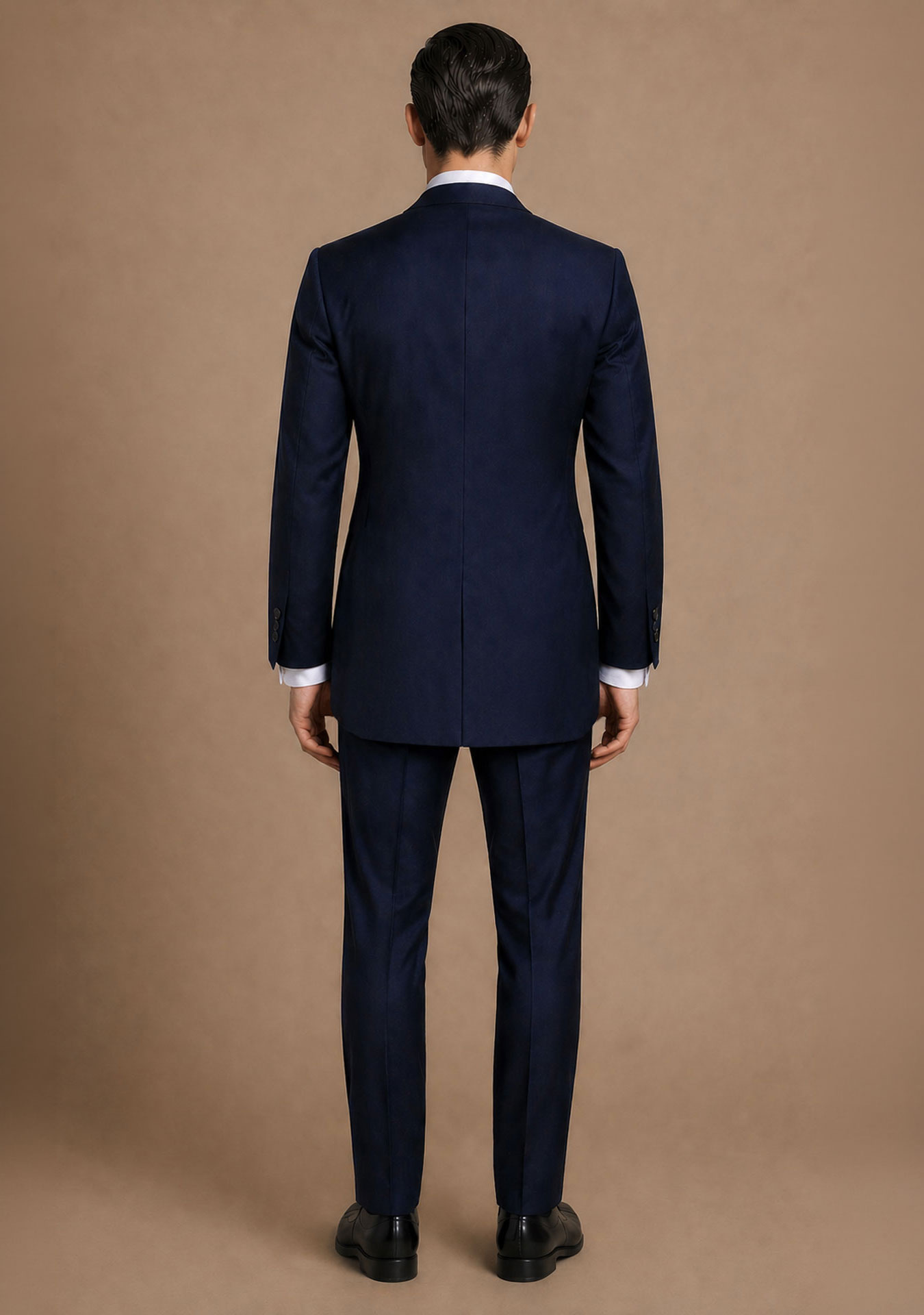 El chaleco, de corte entallado y doble botonadura, aporta contraste y eleva el conjunto hacia un estilo más ceremonial. El pantalón mantiene una línea recta y ajustada, rematado con zapato negro clásico de piel.