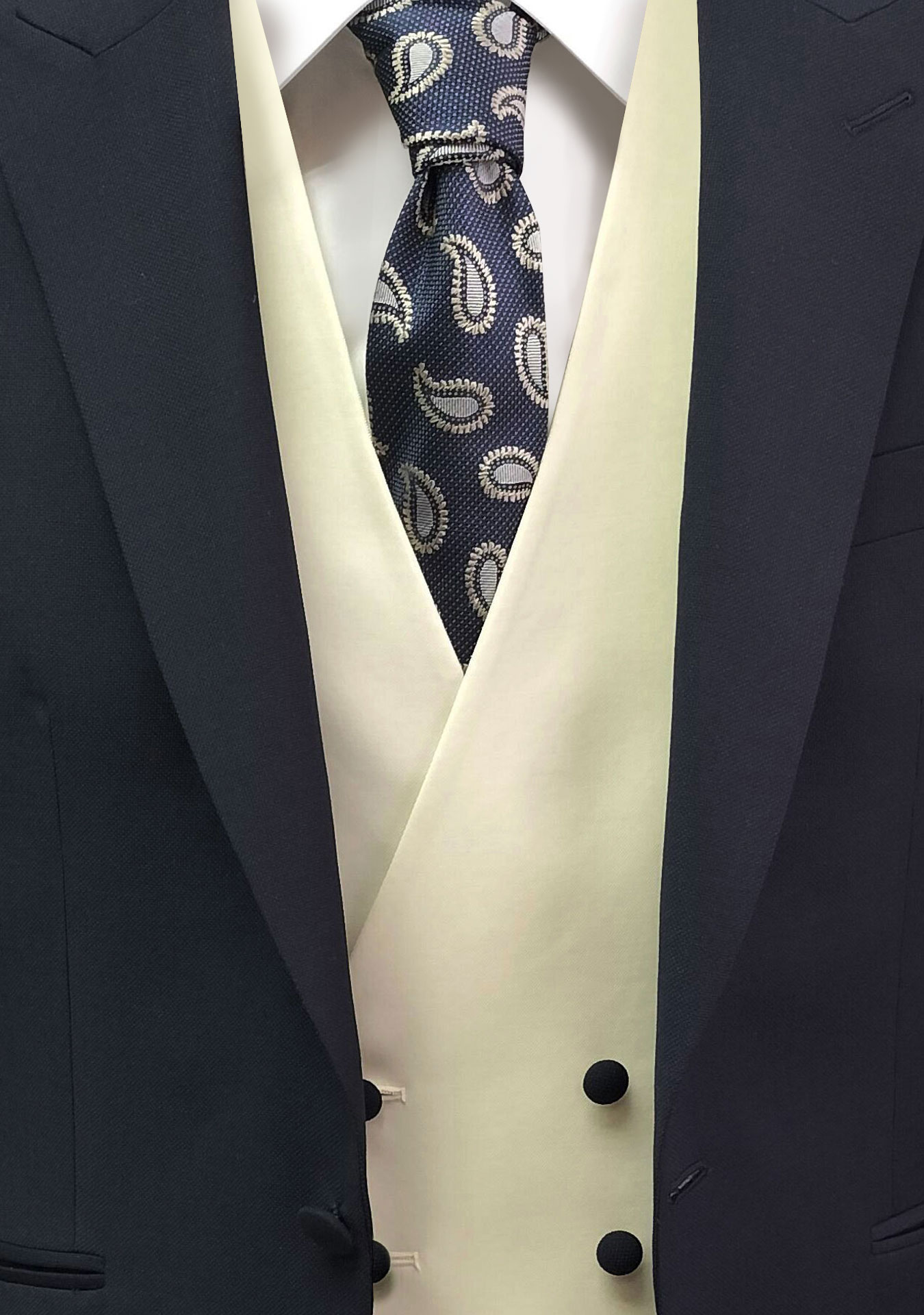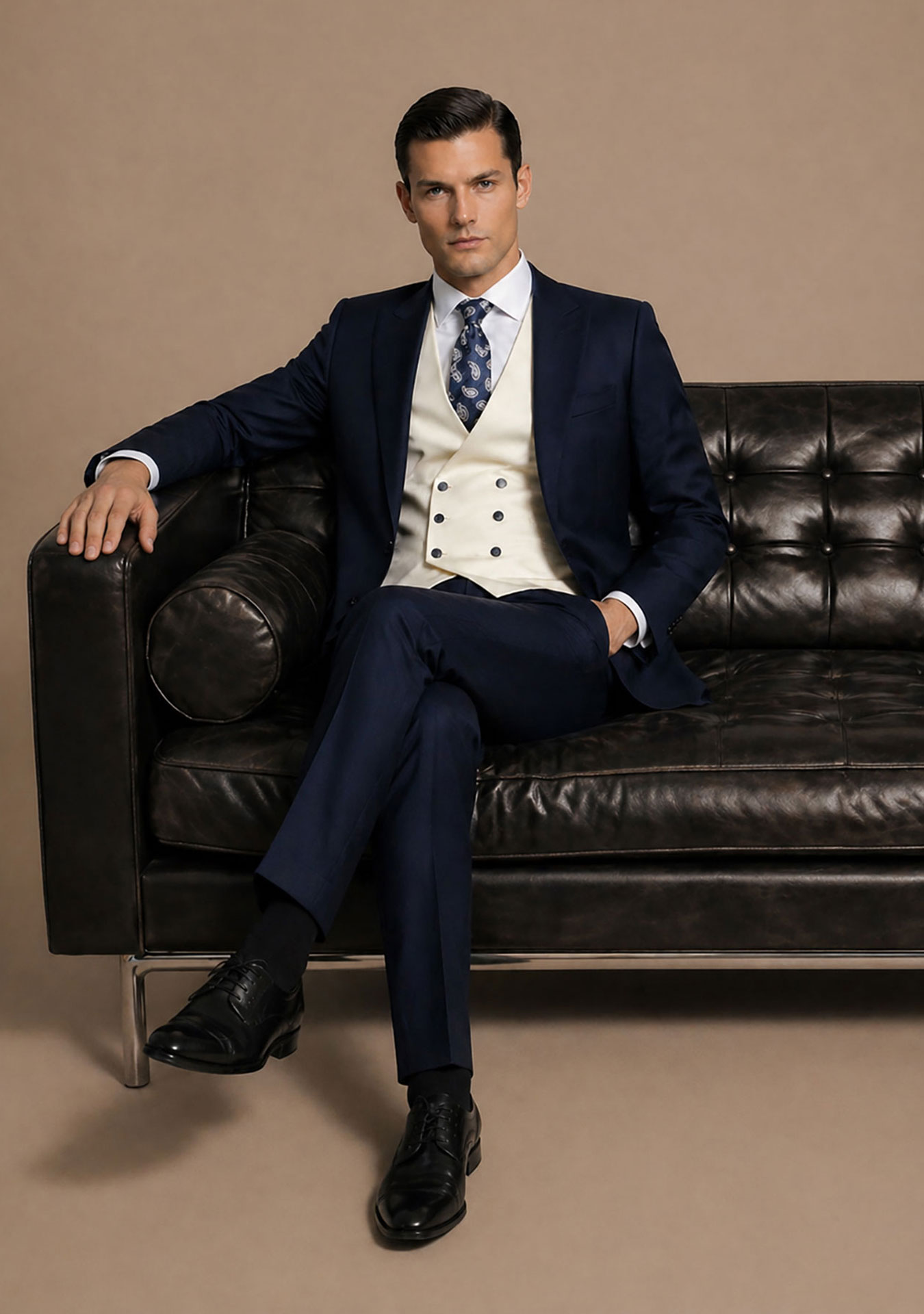 Traje azul marino slim confeccionado en tejido de aspecto liso con ligera estructura, combinado con chaleco semicruzado en tono crudo y corbata coordinada con motivo paisley en gama azul.